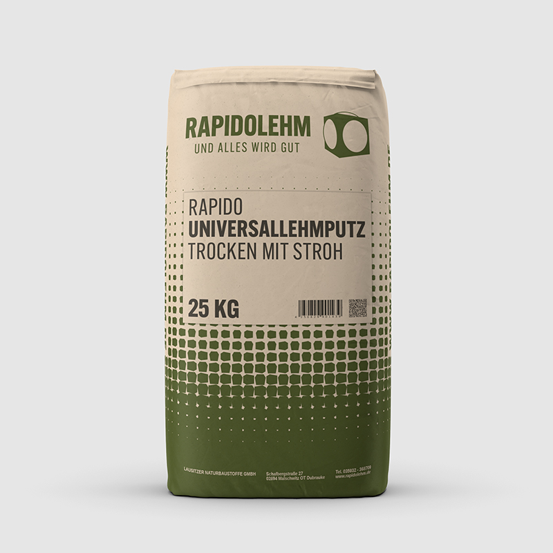 Der erdfarbene Rapidolehm Universallehmputz trocken nach DIN 18947 besteht aus speziellen Tonen und Sanden mit der Kornstärke 0 - 1,2 mm und Stroharmierung.